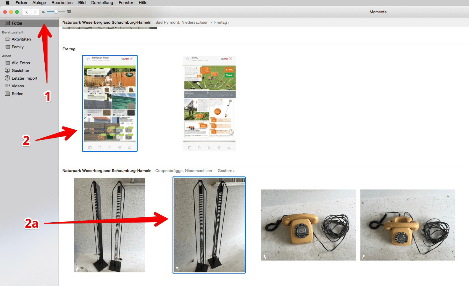 2. zu löschende Fotos auswählen, wie z.B. auf dem Bild zu sehen (1 bis 2a)